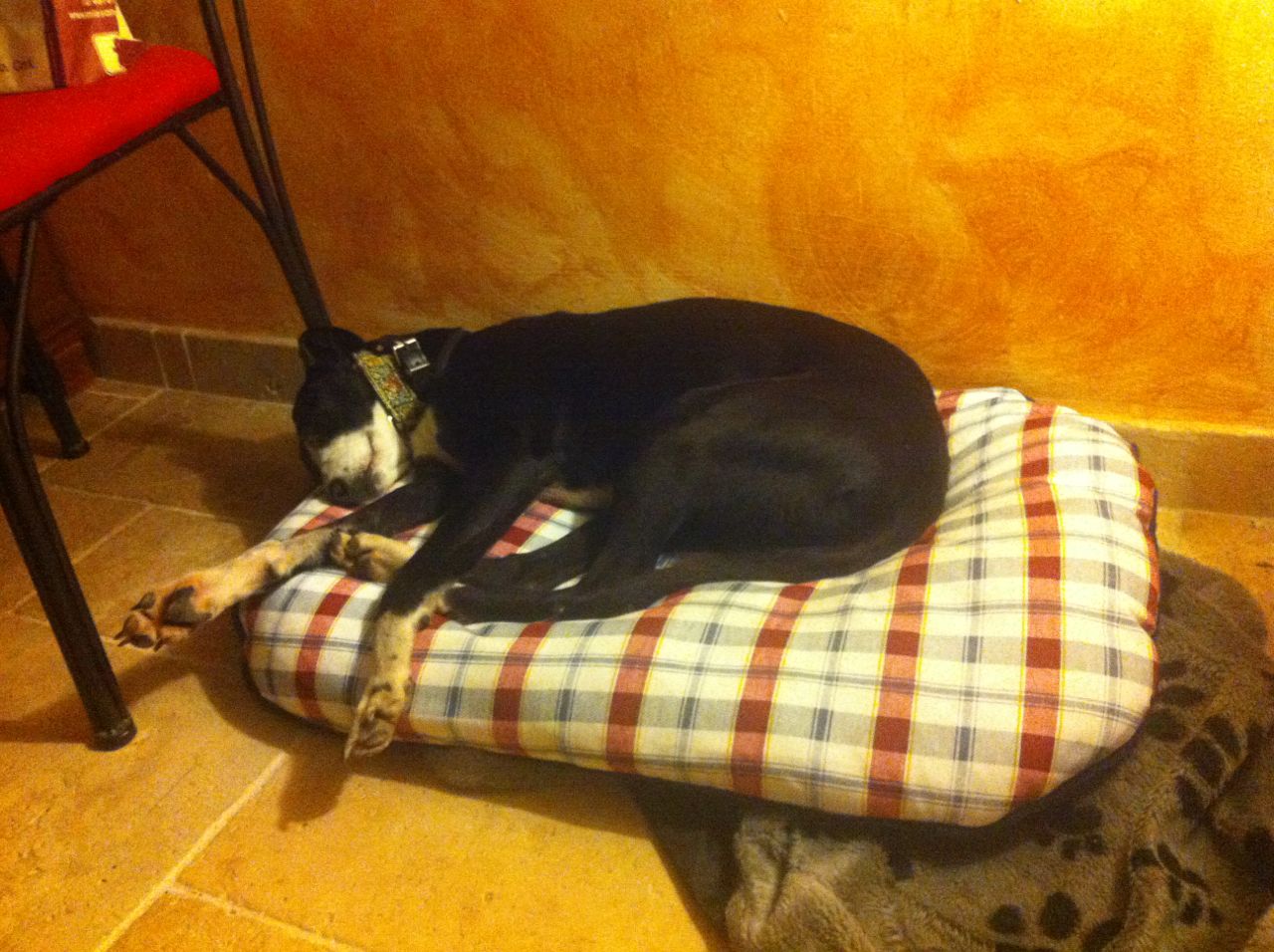 In the first five days since leaving the refuge, Rosie passed the night in four different places – Tansy’s house, the ferry, a hotel and finally here in Céreste. She has met loads of new people and new dogs and is now adjusting to a new, and very different, environment. She’s taking it all in her stride, keeping her elegant composure all the time. From what I’ve been told, she’s the very epitome of the Lurcher race – laid back, calm, friendly, keen to please. Oh yes, and good at sleeping.