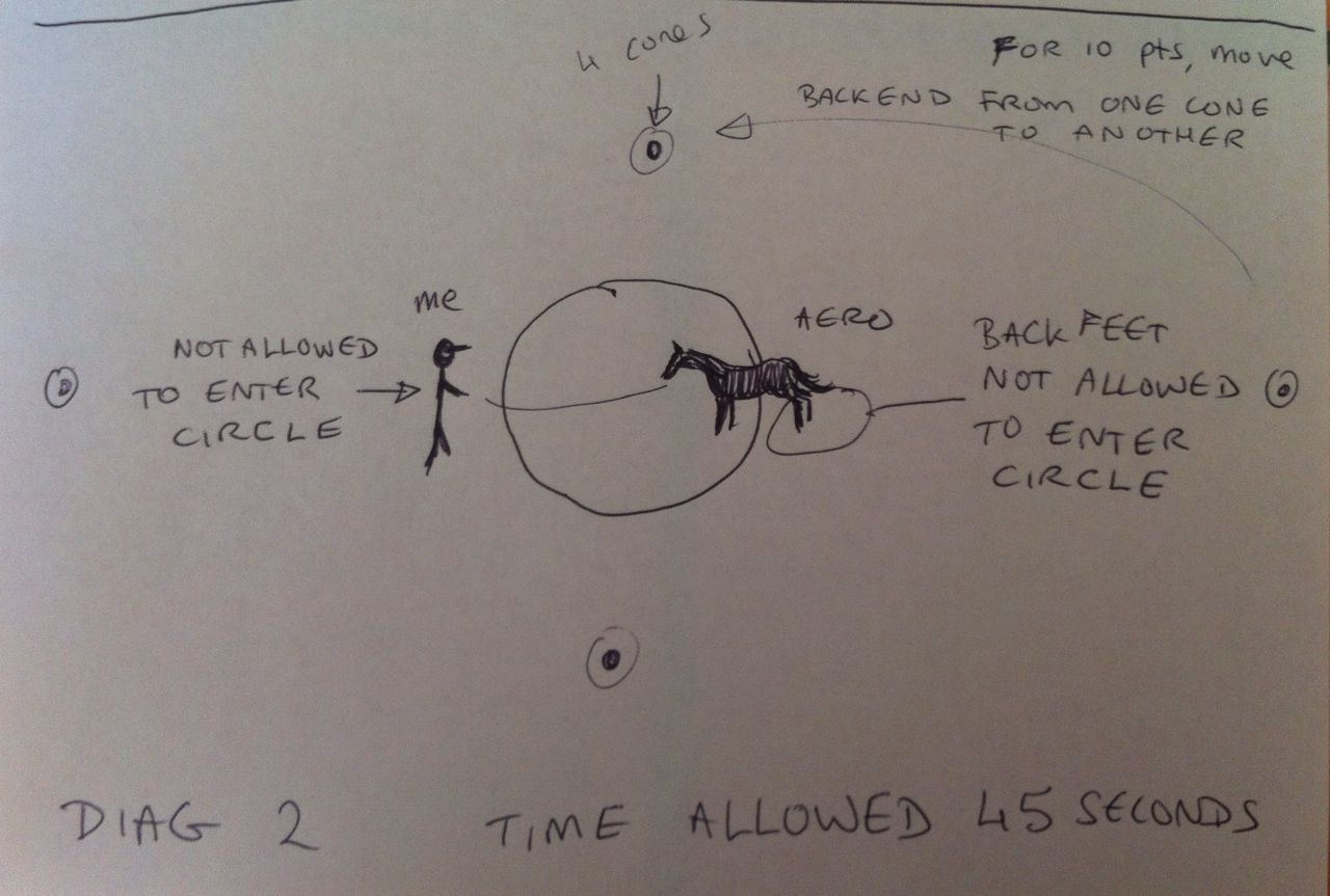 We started off with the Embûche (literally, ‘Pitfall’ or ‘Trap’, but this word is also used to refer to an exam paper full of trick questions). This was set up in a round pen (see diag 1). We had 2 minutes to perform everything.