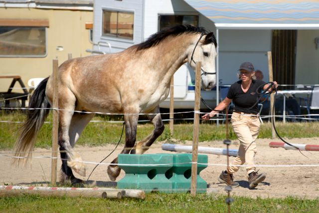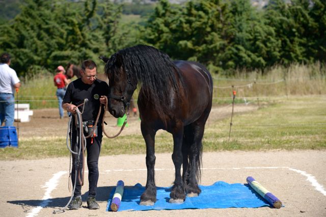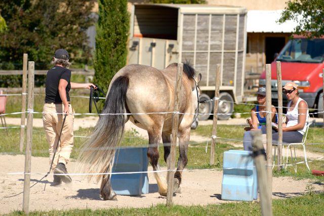 The first test is the embûche (literally, pitfall). It’s set up in a small lunging ring. It has three obstacles – pass between two blocks placed about 1Metre apart; walk over three poles on the ground; and a small, narrow jump made out of two blocks, so I reckon it’s 140cm wide, 50cm high.