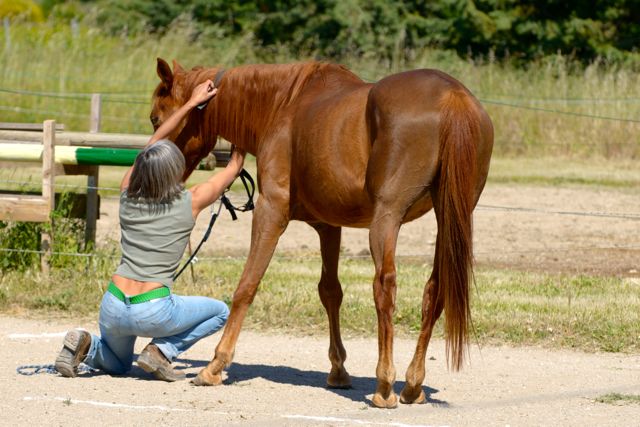 He follows obediently, with just a light touch on his chin, despite the distraction of tufts of grass in the arena. Now I have to put the head-collar back on, while keeping one knee on the ground. Damn, this would be a lot easier if I hadn’t scrumpled the head-collar and lead rope all up together when I took them off!