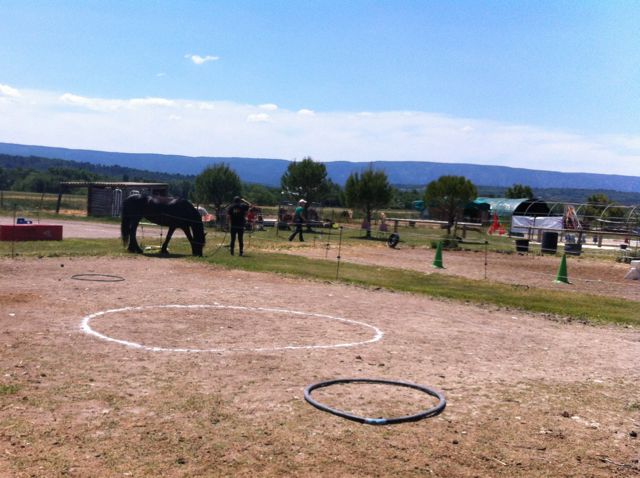 A landing site for the MotherShip? No, a test of lateral movement. The handler must stay within the inner circle. The horse’s front legs must be inside the outer circle and his hind legs outside. He then moves sideways around the circle, so that each little blue thing passes under his belly.