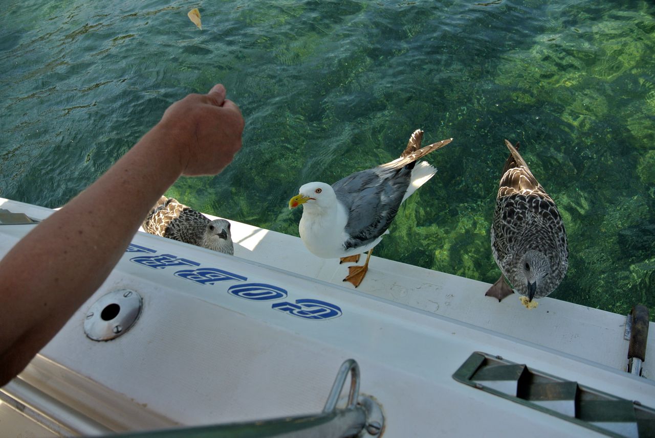 It seemed awfully cute when the two baby gulls climbed onto the boat to be fed too, but I fear we may have started them off on a life of begging and thievery.
