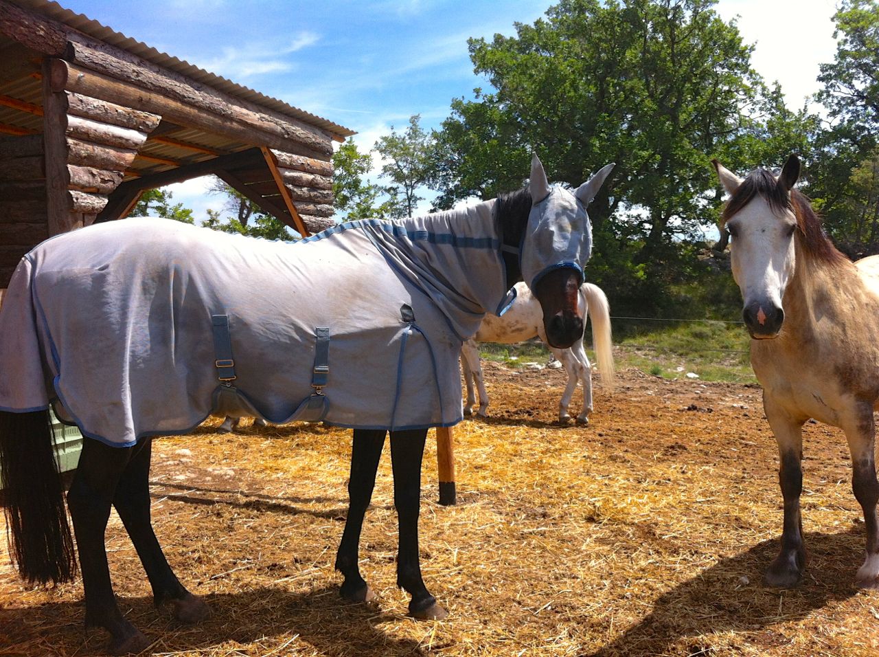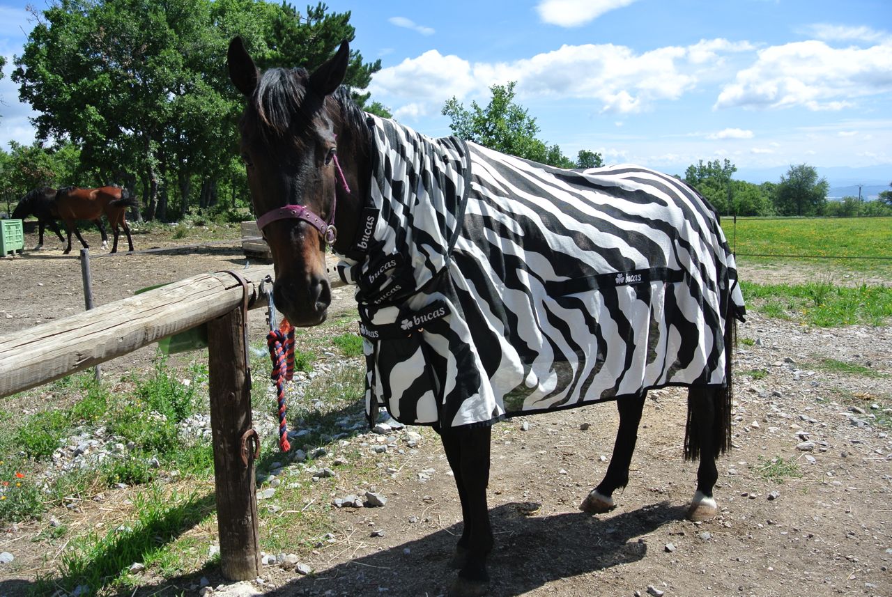 I was very pleased with Aero’s Bucas Zebra Stripe fly rug initially. It made a huge difference to his comfort from a ‘being bugged by flies’ point of view and it looked cute. Apparently it was a talking point in the local villages (Did you see they have a zebra there now? Is she training a zebra?) and it’s in loads of strangers’ holiday snaps – it was a regular occurrence to see a car stopped beside the horse’s field with a tourist beside it taking a photo of the horse disguised as a zebra.