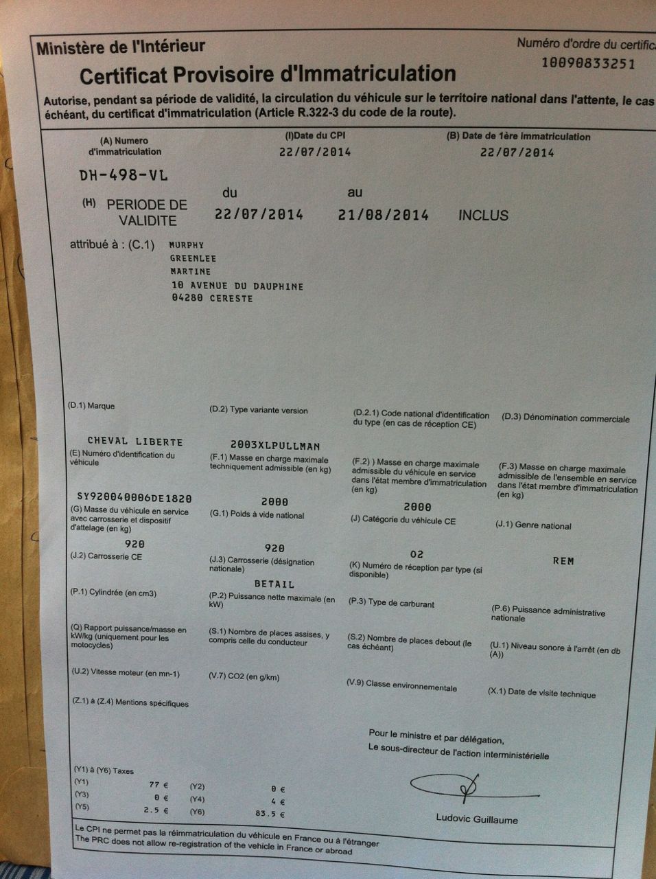 I was only shaking a little bit as I went back to the lady behind the window. Ten minutes later, I was leaving La Préfecture, in dire need of a coffee and with my Carte Grise Provisoire clutched tightly in my little fist. Strike three for DRIRE lady – but I didn’t care, I had what I needed to insure the trailer and hit the road.