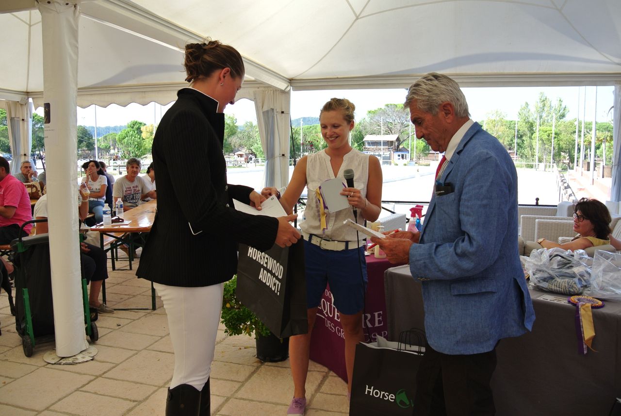 But, being a young horse class, the judges discuss their marks with the riders over the speaker system after each test, so we get instant feedback. They award marks out of 10 for walk, trot, canter, relaxation/submission and harmony. I couldn’t understand what the judge was saying, mostly because the speakers were garbling his words, but I did hear a lot of sevens. They finished up with 75.1% – Premiere Prime! Just what they needed to qualify for Saumur! And not only did they get their qualifying mark, but they won the class! Yippee!