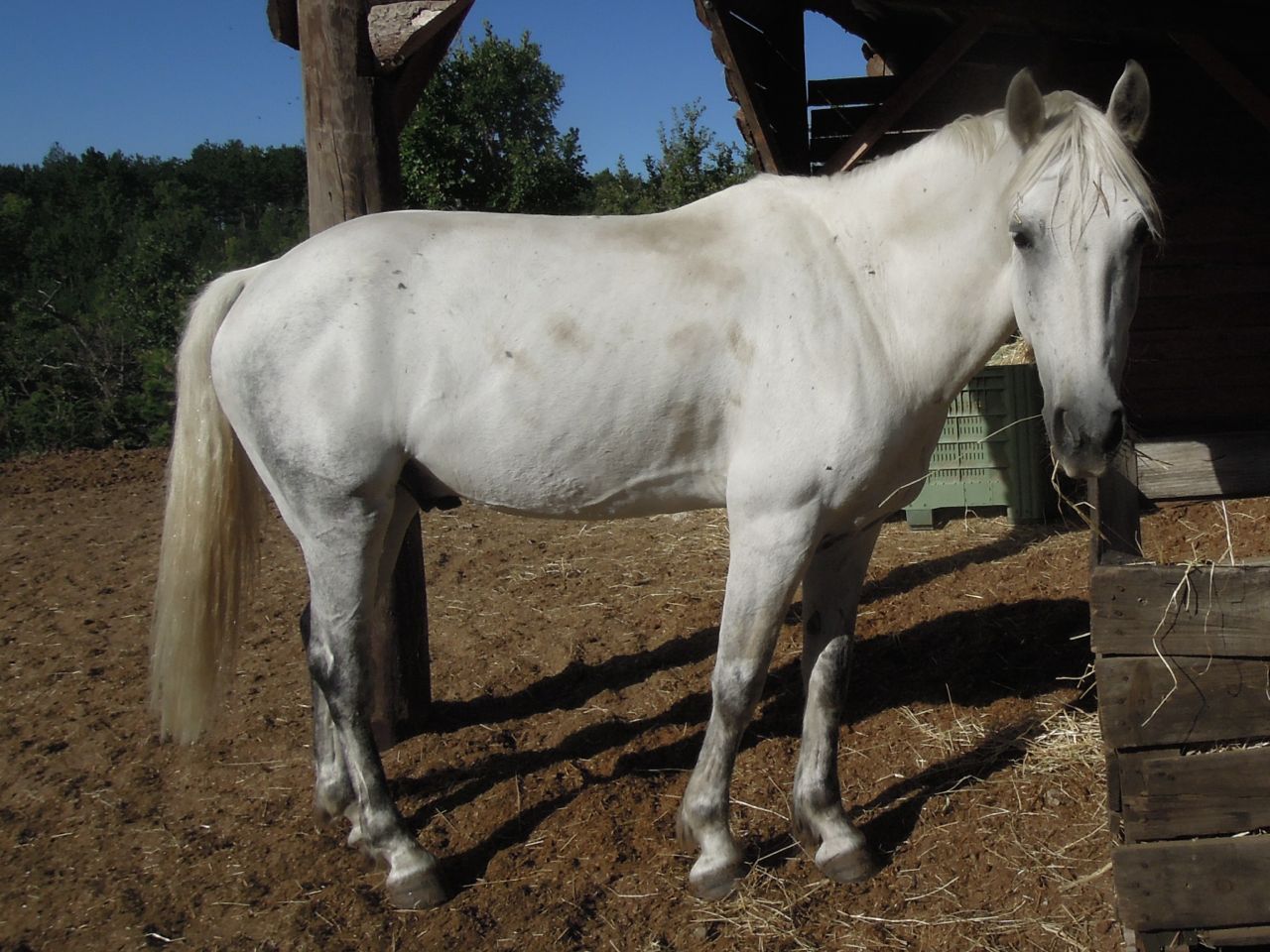 I’ve been working either one horse or the other each day for the last week, except when I was away at Vidauban, of course. The August break has really done Aero good. He’s been incredibly attentive and responsive with work on the ground. After a particularly good session last week, I decided to finish up riding him (bitless) for ten or fifteen minutes. My back has been a bit grumbly (I haven’t been practising my yoga, bad me!) so we stayed in walk and just worked on turning and bending. He is improving steadily, so much so that we were doing serpentines with me just using my leg & weight aids to turn. Hmm, I thought. I wonder… so I tied the lead-rope around his neck and rode with just that to see if I could get the same response. Indeed I could… stop, start, turns and circles with no reins at all (In walk. Don’t get too excited!). Who knows where this bitless stuff will lead!