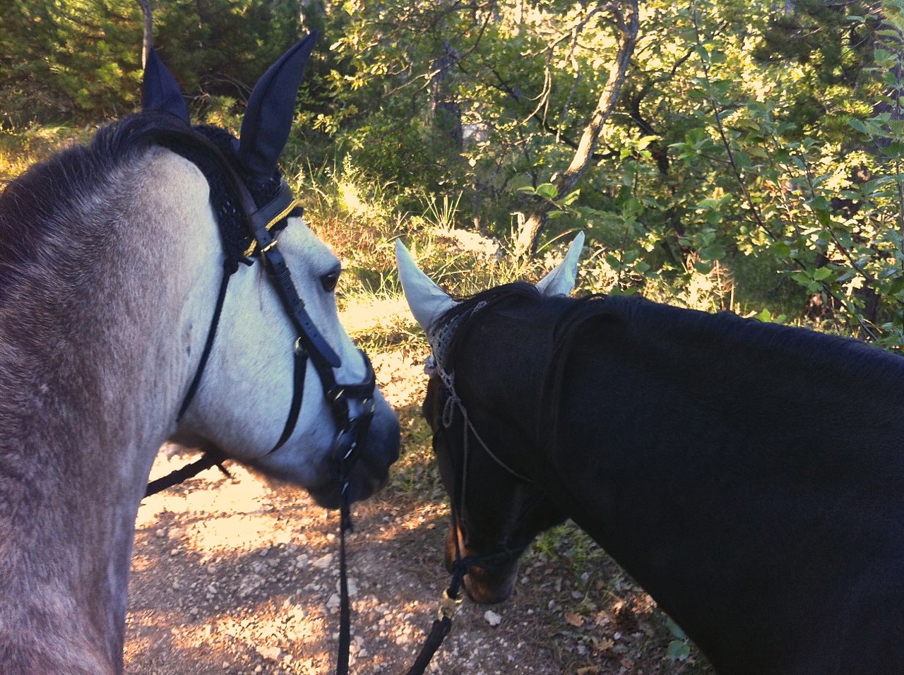 I’ve only been out on one hack since we started back after our August break so, this morning, I got up to the farm early (to try to avoid horseflies) and took both boys out together. Aero once again surprised me by how well he remembered our leading (ponying) lessons. We did one practise lap in the arena and it was really easy to get him to walk/trot/halt beside Flurry, with his head mostly level with my knee. We did the easy, forty minute route out the back of the farm and along the ridge that looks towards Vachères.