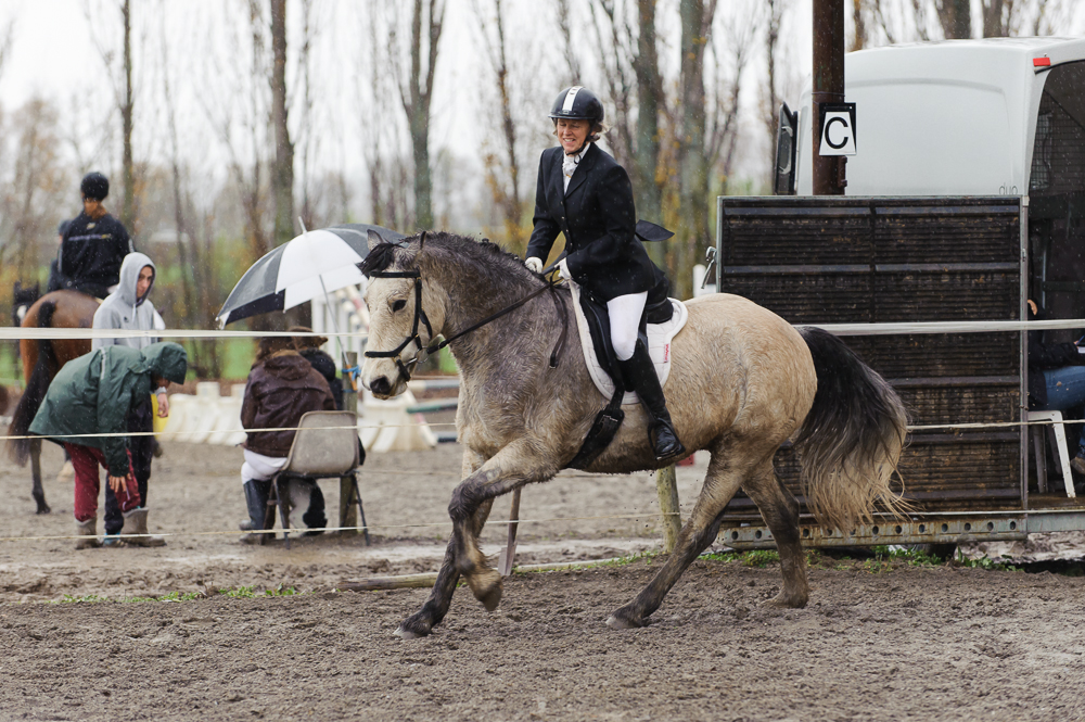 It was persistently raining by now and we decided that the best thing to do was for the LSH to take the horses home while Marine, Mathilde and I waited for the prize giving. Rusheen loaded easily enough for Alexandrine (she has a magic touch), Flurry stomped blithely up the ramp and the LSH took the wheel. The jeep slipped and slid its way across the field, only to become stuck on the slight incline leading out to the road. Would we have to unload the horses again? Hay was deployed under the wheels, and the four of us – Alexandrine, Mathilde, Marine and I – put our shoulders to the back of the trailer and pushed. Girl Power rules – with wildly spinning wheels, the jeep finally got its nose out onto the road and they were away.