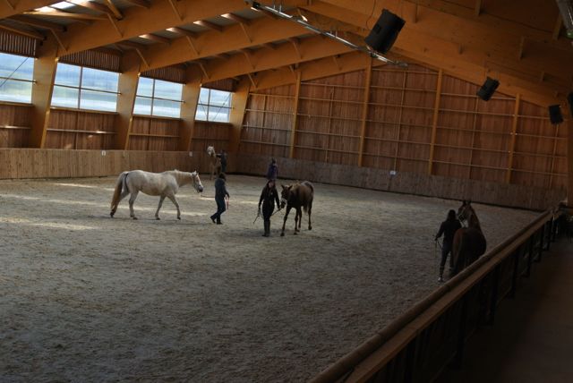 We went off to meet Guillaume Assir-Becar (hereafter referred to as G) and our fellow attendees in the big reception room in the main house. There was coffee and croissants laid on and we all introduced ourselves by turn and described how much of this sort of work we’d done with out horses. It turned out that there were six who had never done it before and six who had done some of it before, so that was how he split us up. I ended up in the ‘advanced’ group, with Alexandrine and MC, both of who are way ahead of me with this stuff! The beginners went first, so we went back and checked on our horses and then meandered over to watch them.