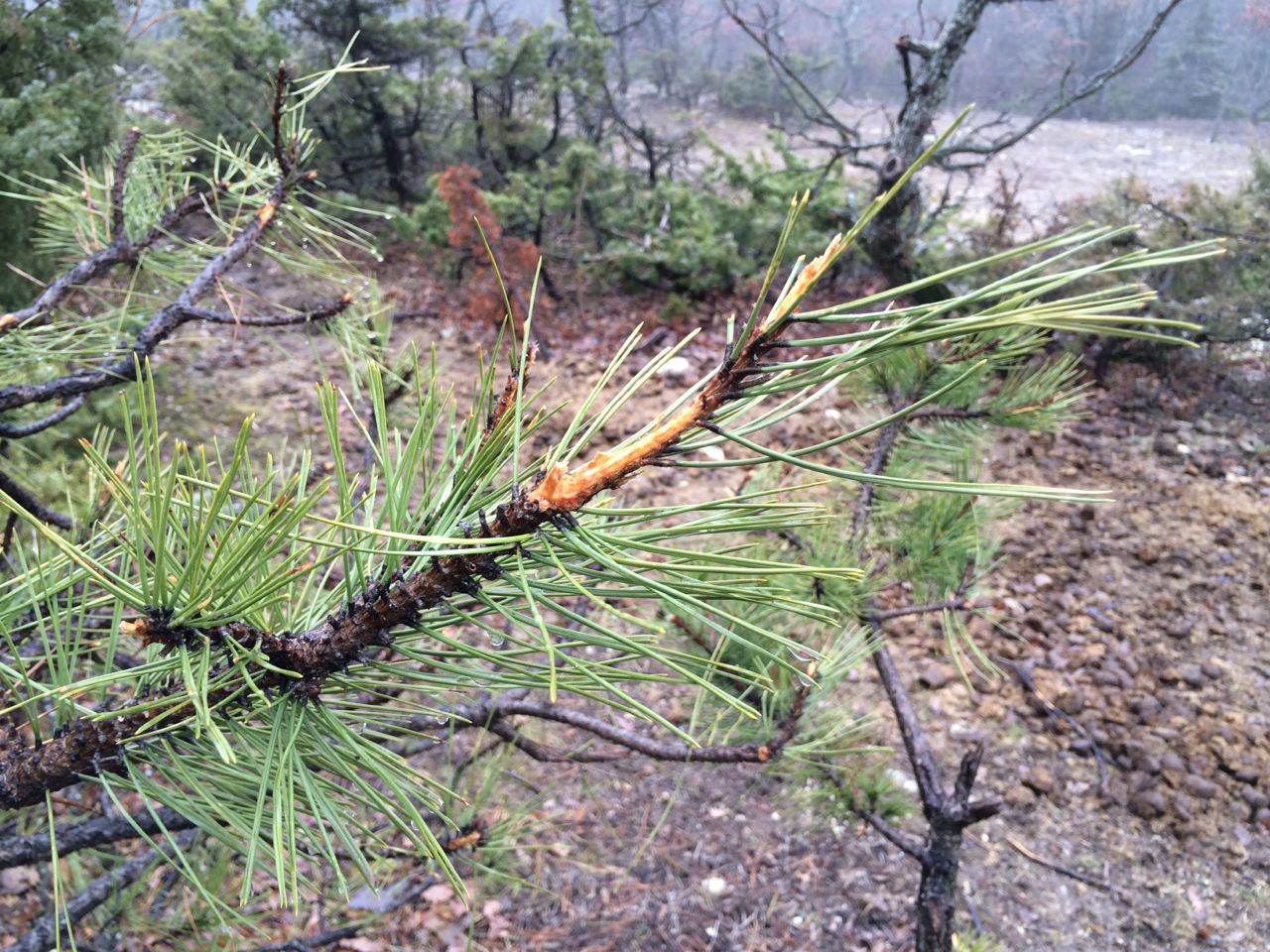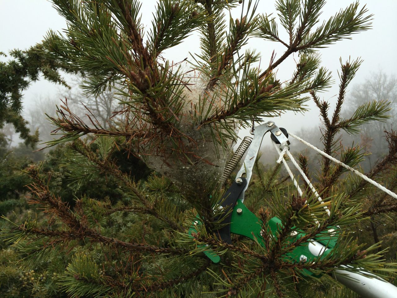 There was evidence of nibbled pine needles on several trees, right beside a nest in one case.