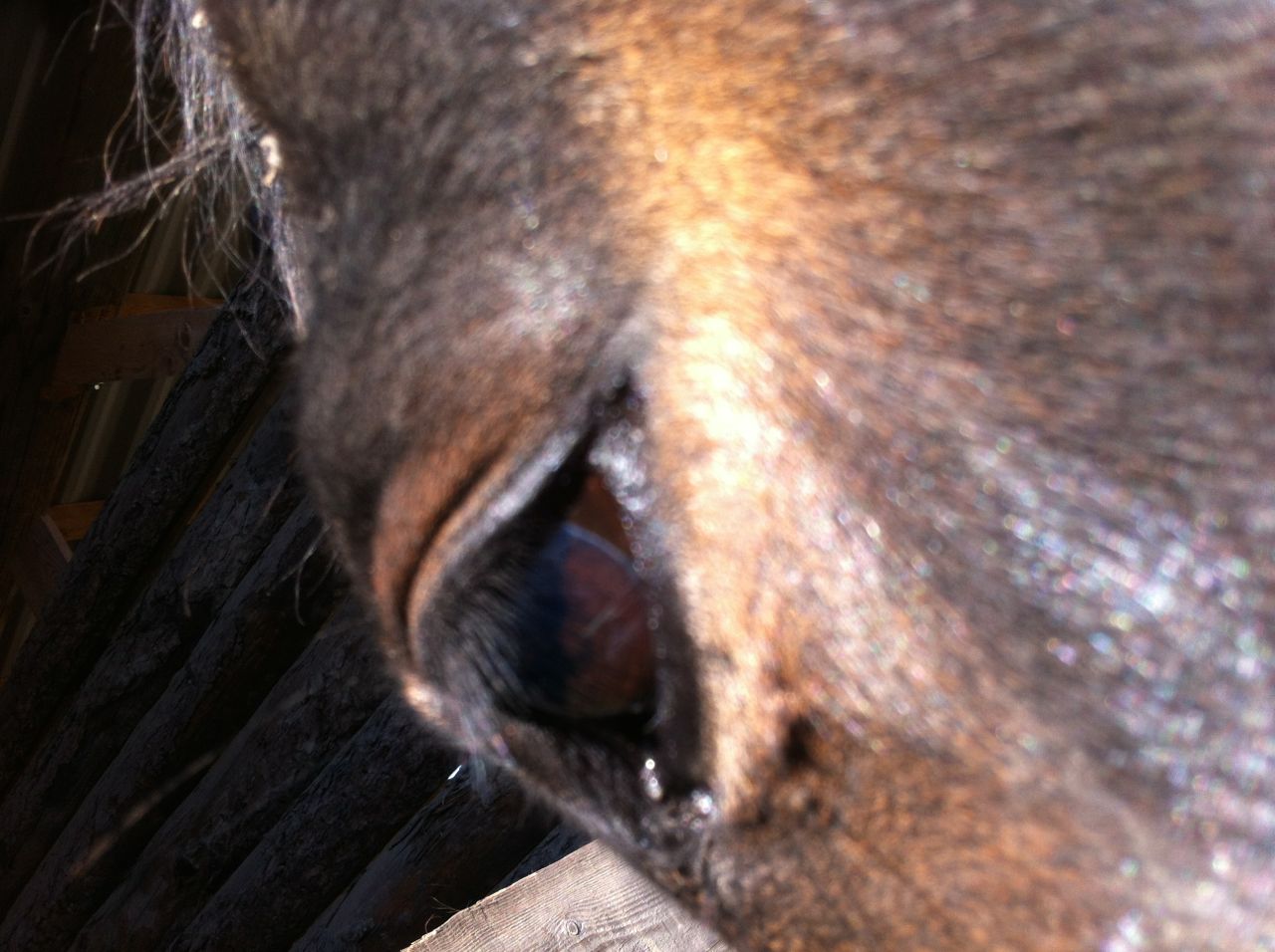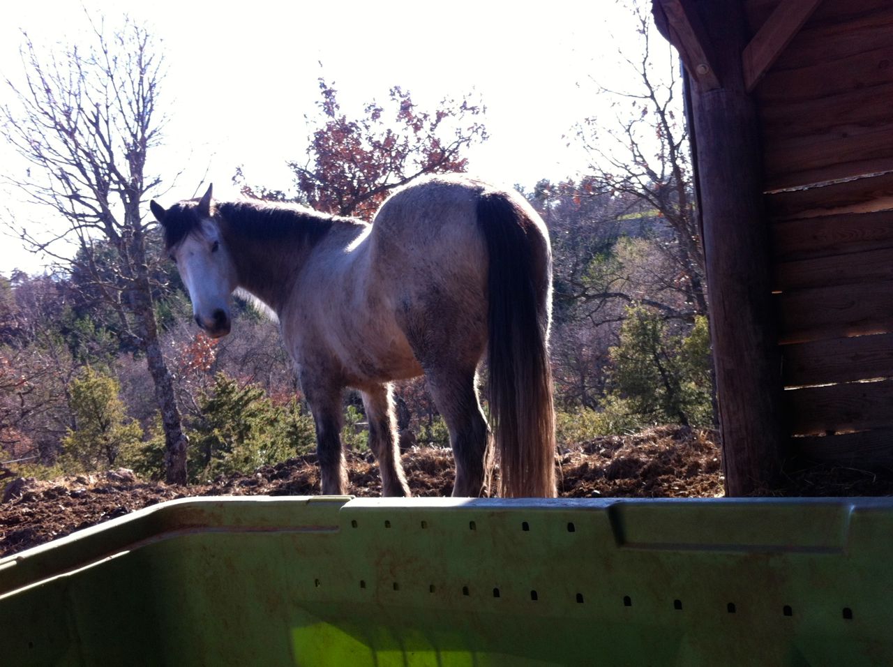 I filled two hay nets and set them to soak. Then I filled another four, for the night and the morning, taking my time. Despite the strong wind, I could still hear air traffic in the distance. I sat on the bale of straw behind the field shelter and enjoyed the sunshine, trying not to think of who or what might be being transported over my head. After a while, I went around to the other side of the field shelter, where the horses were. I climbed into Aero’s feeder (it’s a giant apple crate) and sat in front of him.