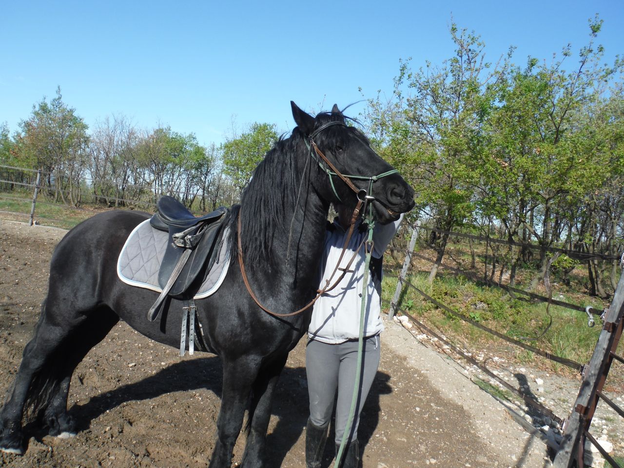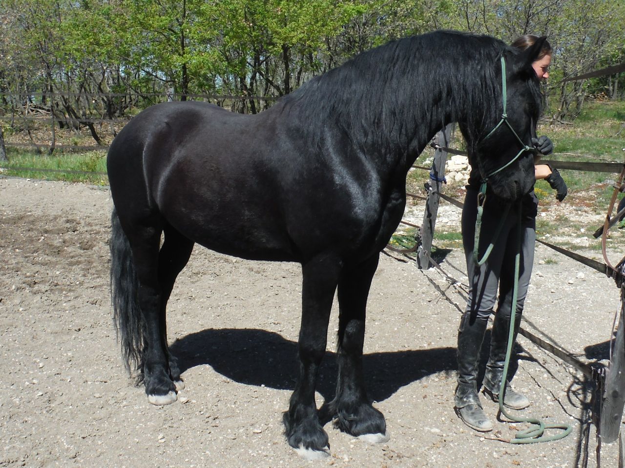You can tell he’s pretty much Friesan just by looking at him, but he has no breed papers to prove it. He was rescued by his owner, N, when she bought him and another horse from a dealer at a fair. Both horses were entire; both were in poor condition; both seemed to be destined for the factory until she stepped in.
