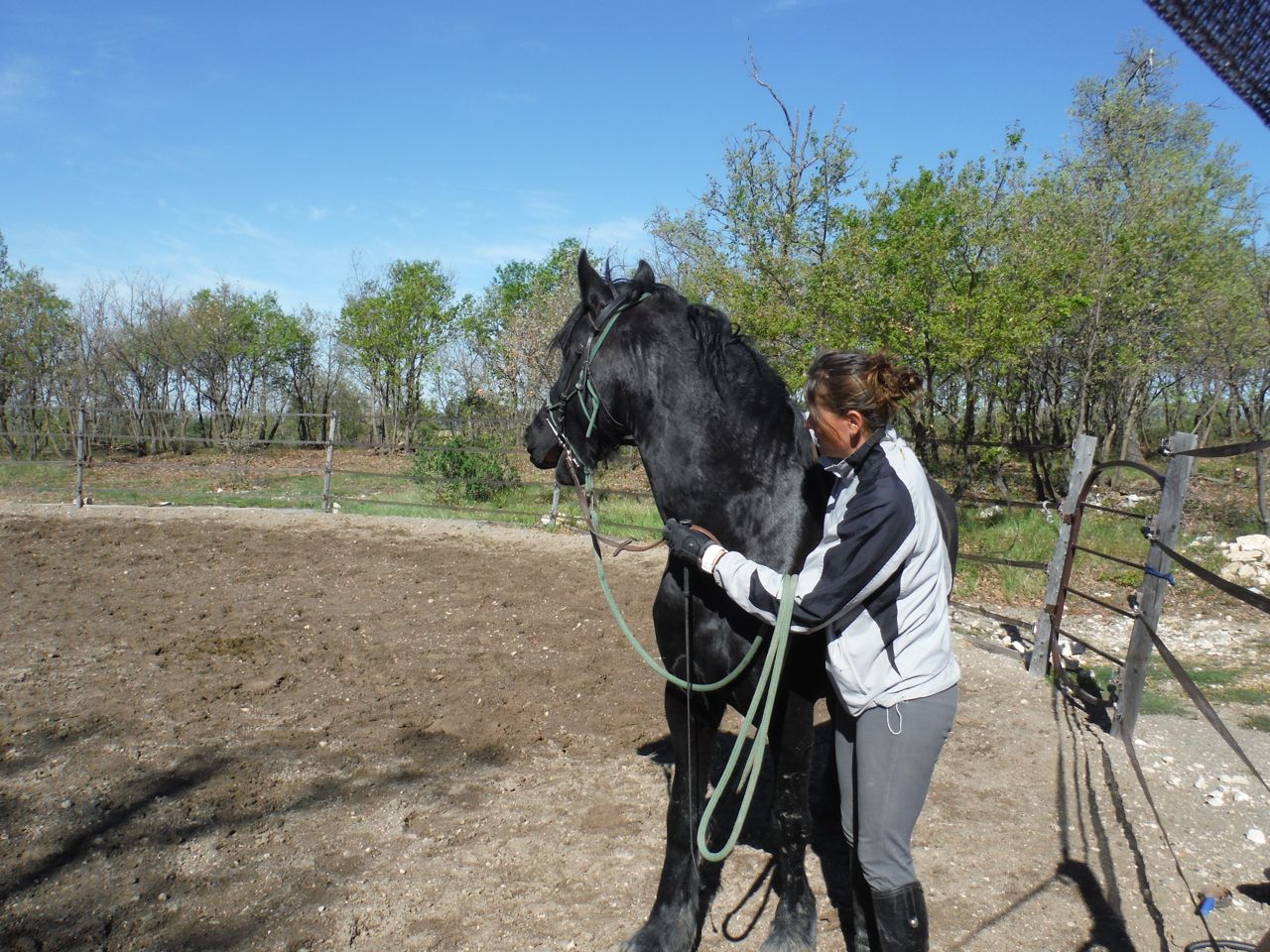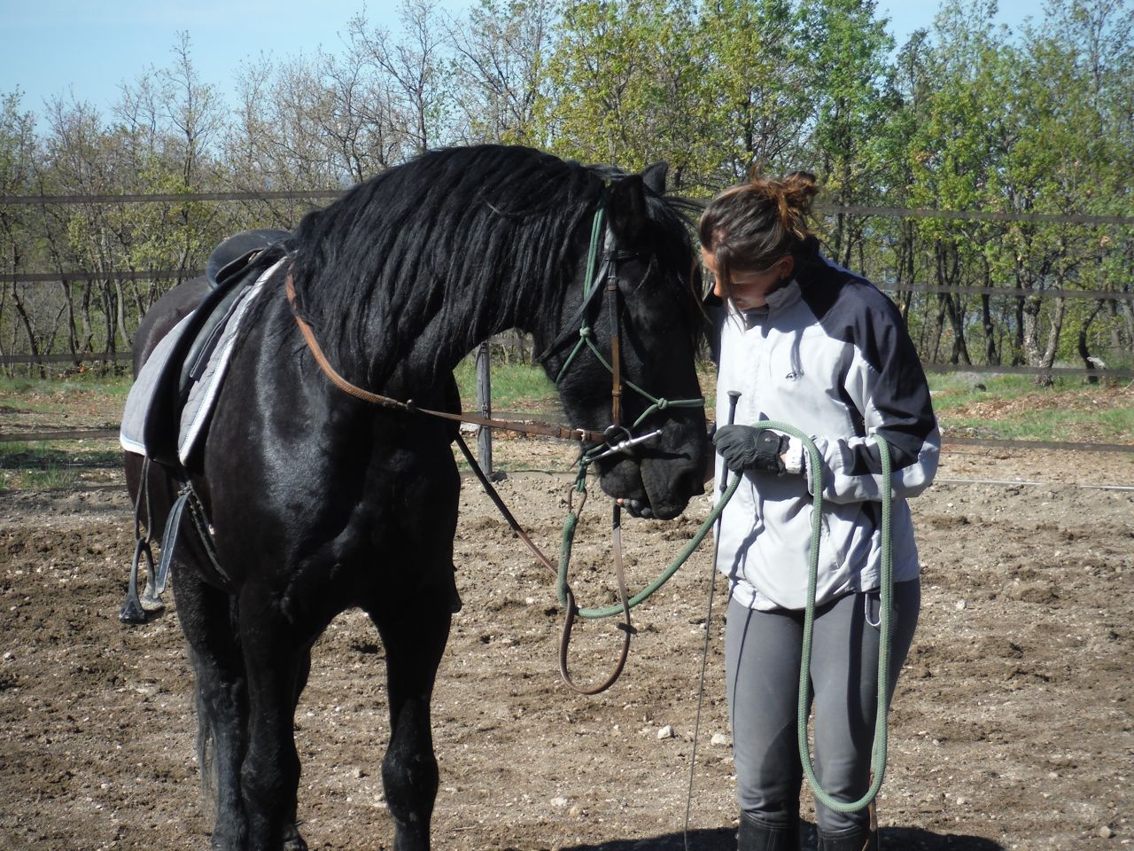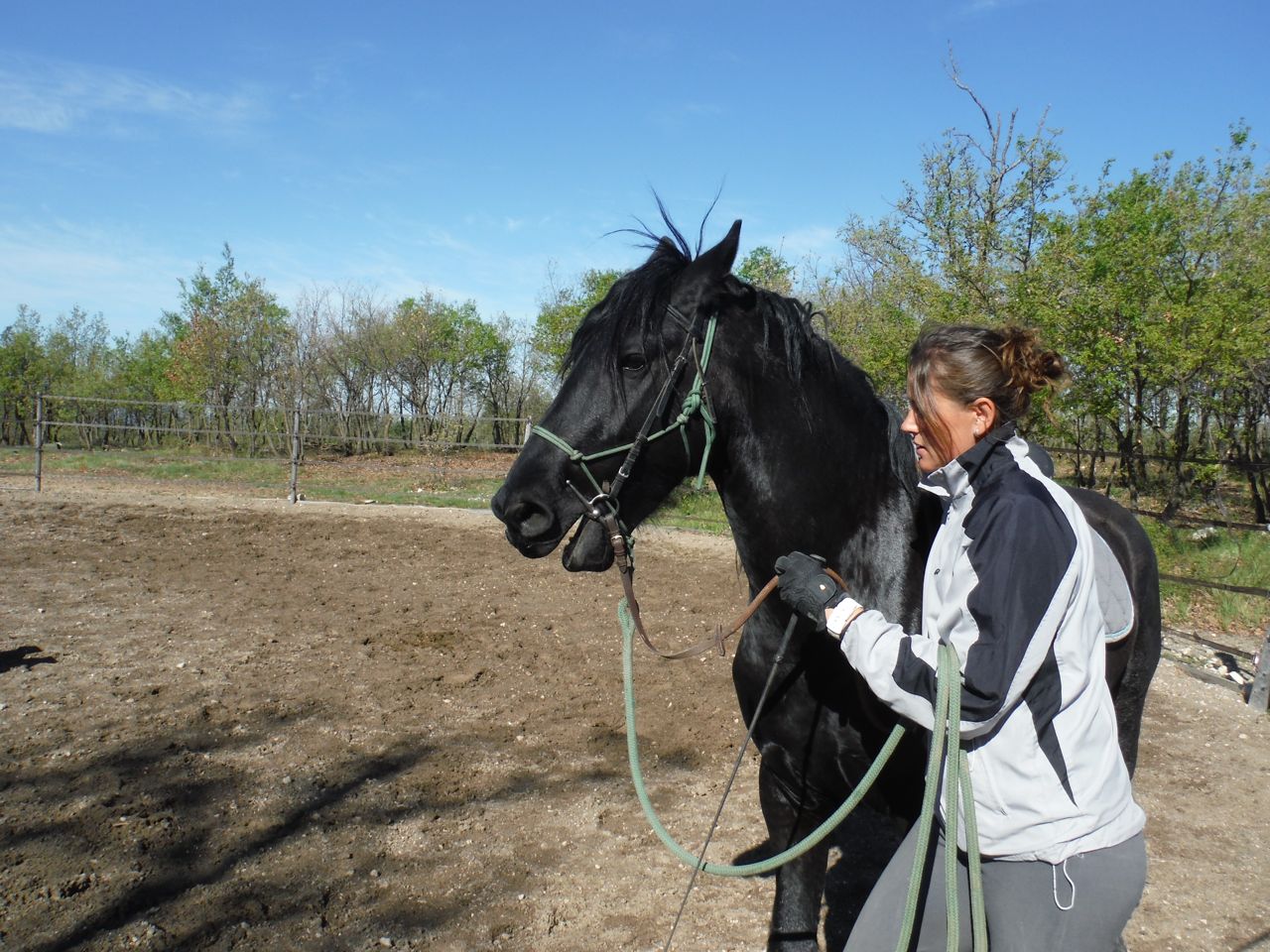 Alexandrine then did some mouthing work with him. There is no tying down, no marching along behind him holding long reins. It is all done walking close to the horse, with her hands holding the reins where they would be if one was riding. I’ve seen her doing this before, when she takes baby horses out on the trail for the first time, before she eventually mounts them, but I hadn’t seen her do it for the first time before.