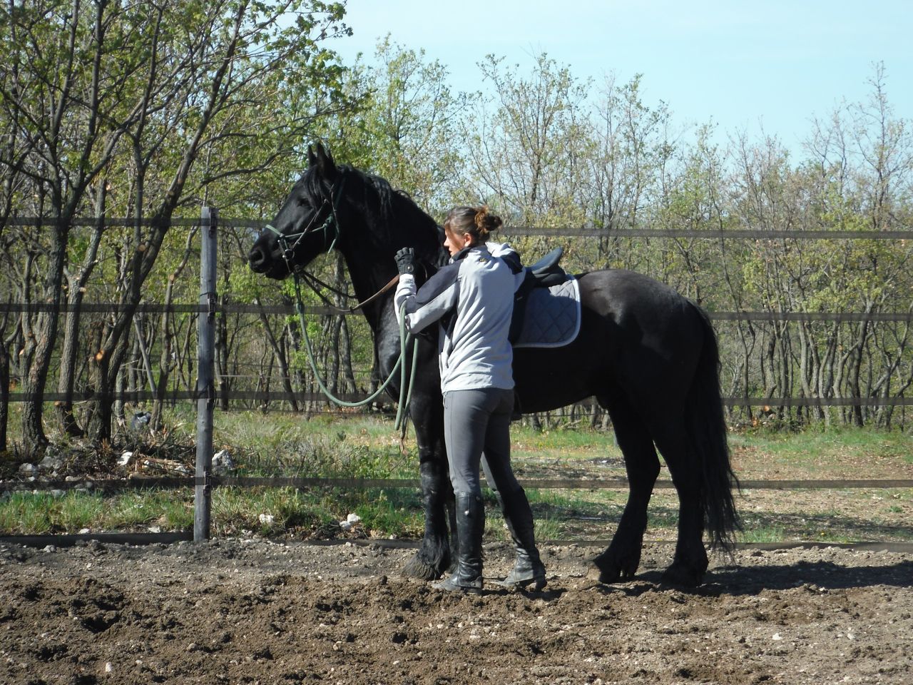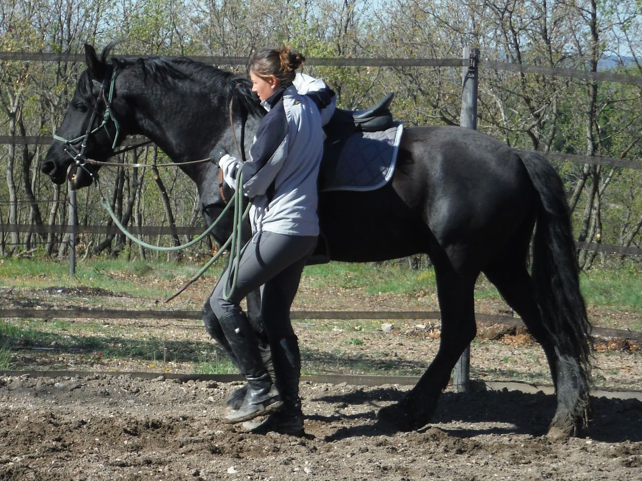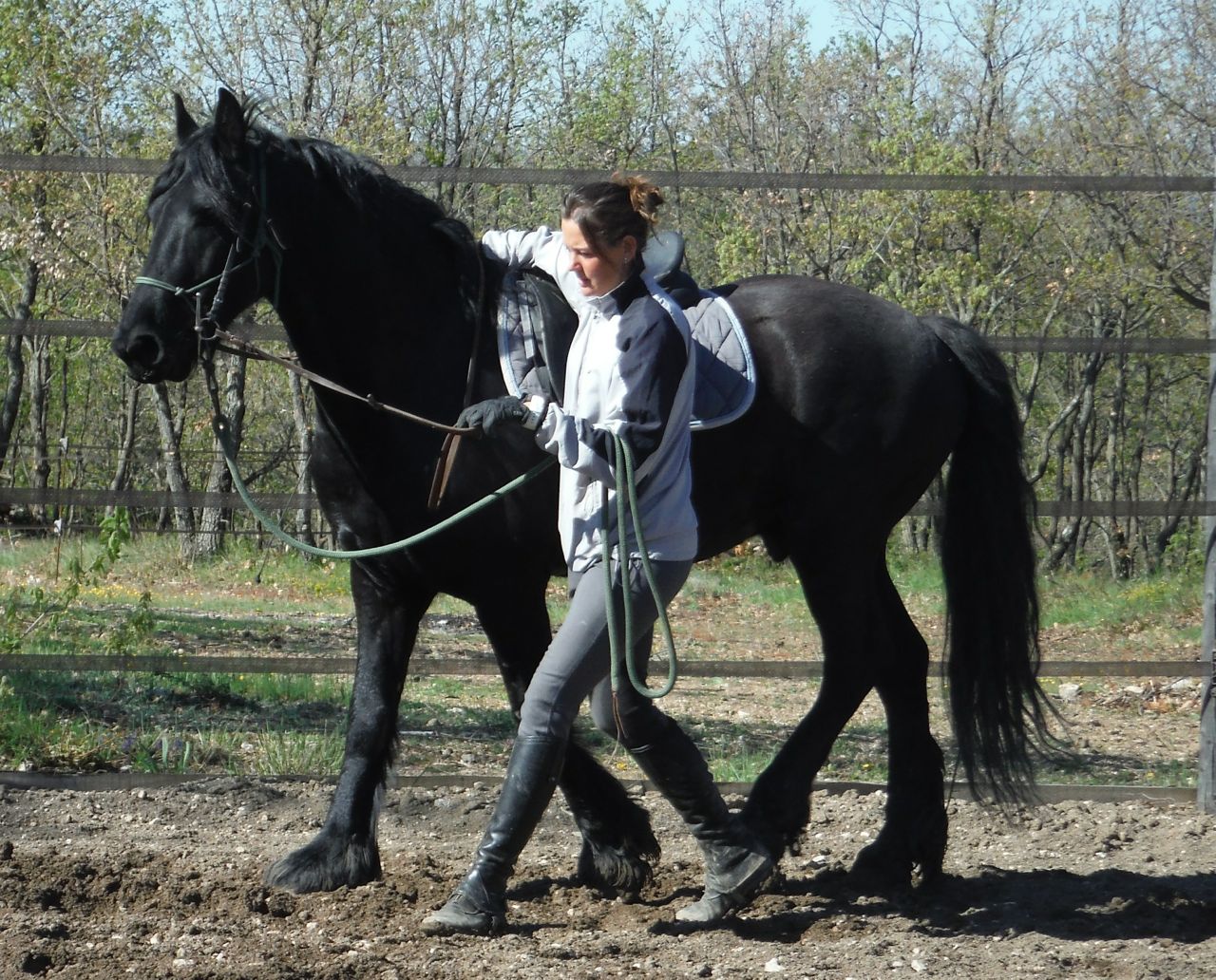 Alexandrine then did some mouthing work with him. There is no tying down, no marching along behind him holding long reins. It is all done walking close to the horse, with her hands holding the reins where they would be if one was riding. I’ve seen her doing this before, when she takes baby horses out on the trail for the first time, before she eventually mounts them, but I hadn’t seen her do it for the first time before.