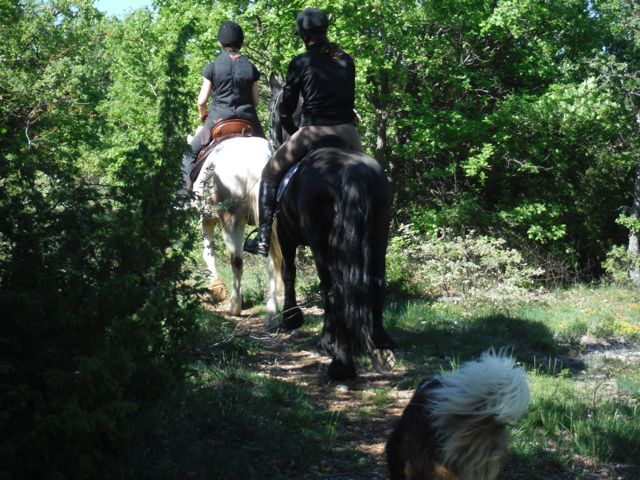 MC decided to dismount and lead Quieto until their hearts stopped racing and we continued, MC in front with Quieto, Alexandrine next on Tilou, me bringing up the rear and the two dogs milling around as dogs do.