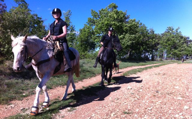 We made our way along the top of the ridge, alongside a field of lavender. The sun was shining, the birds were singing, the dogs were mooching around as dogs do, the horses were calm, the riders and I were relaxed and happy.