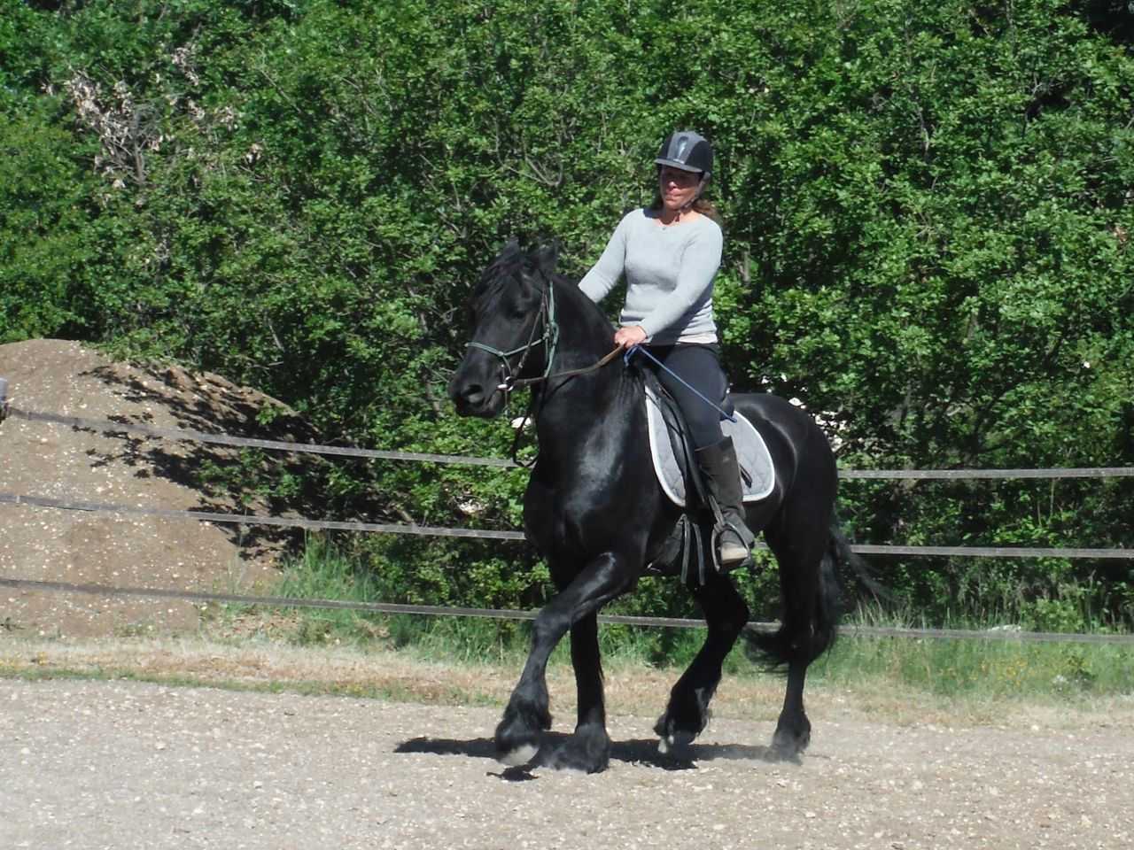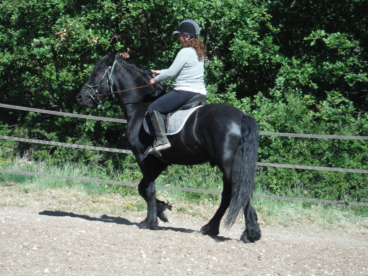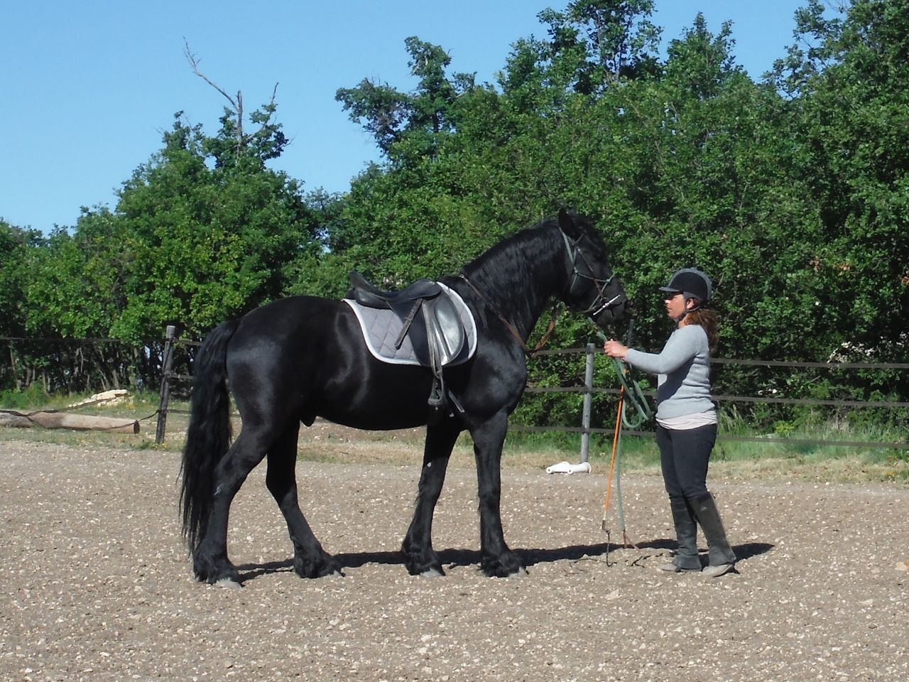 Alexandrine spent a couple of days working on lunging as a result. She worked him in the round pen and then in the big arena, but she did everything she could to give herself the upper hand when she took him into the big arena. She attached the lunge line to the bridle – clipped to the bit ring, passed behind the ears and run through the bit ring on the other side. A severe arrangement, but Tilou had to learn that pulling away was A Very Bad Idea and she was happy that he had got the message. His ridden work continued, with N hacking him out twice during the course of those few days. The first day she rode him out, he reared and she fell off. Oh no, I thought – he’s so smart, he’ll remember that’s how to dislodge his rider! But no, Alex assured me it was nothing. A tiny rear, N slid off, landed on her feet and got straight back on board again. And the next day, everything went perfectly.