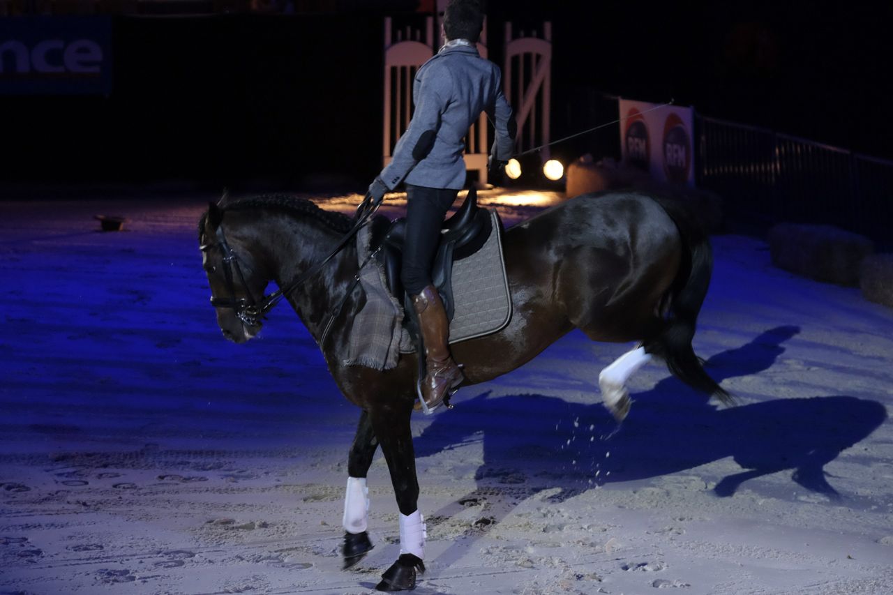 The French are mad for Spanish walk, so of course that was shown. It’s very impressive, but once again this horse couldn’t keep any sort of a rhythm going. He’d throw a leg out dramatically and then take a couple of short, hoppy steps before throwing out the other leg.