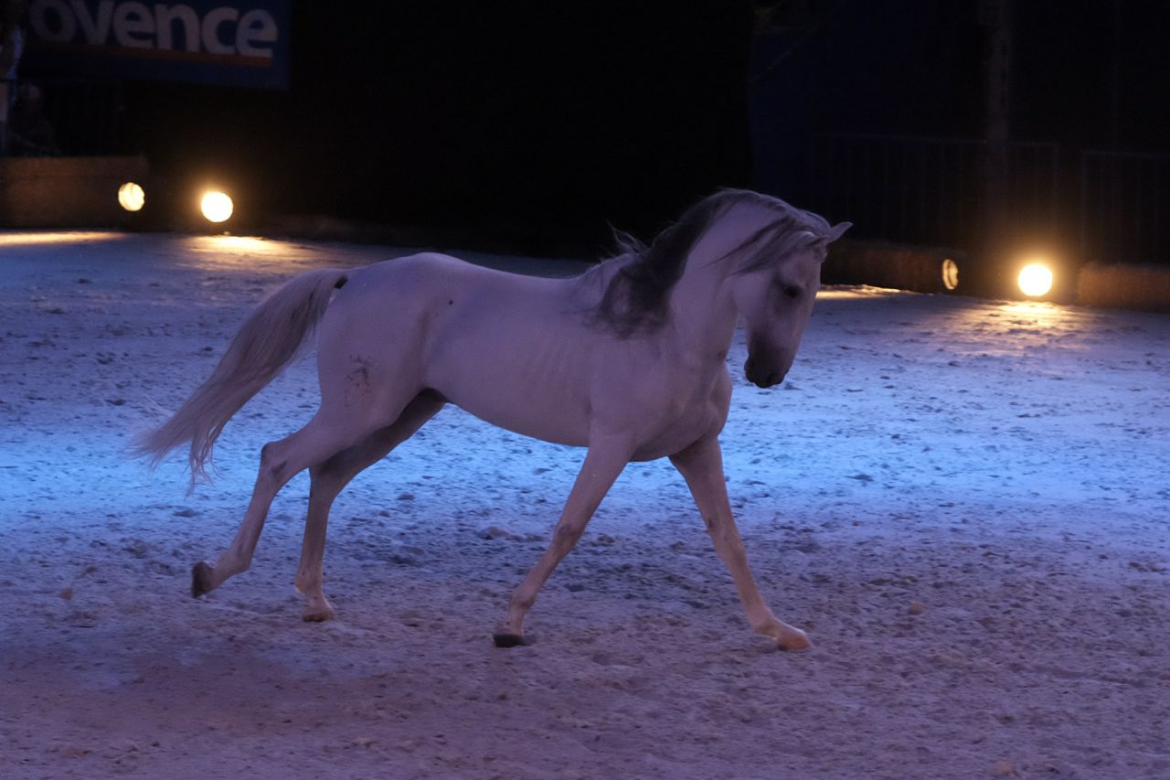 They left the arena and a lone grey stallion came galloping in all by himself and all the kids in the audience went “Oooh il est magnifique!” Then the stallion stopped to sniff at some poop on the ground and did his level best to cover it up, so all the kids went “Ewwww” instead of “Oooh.”