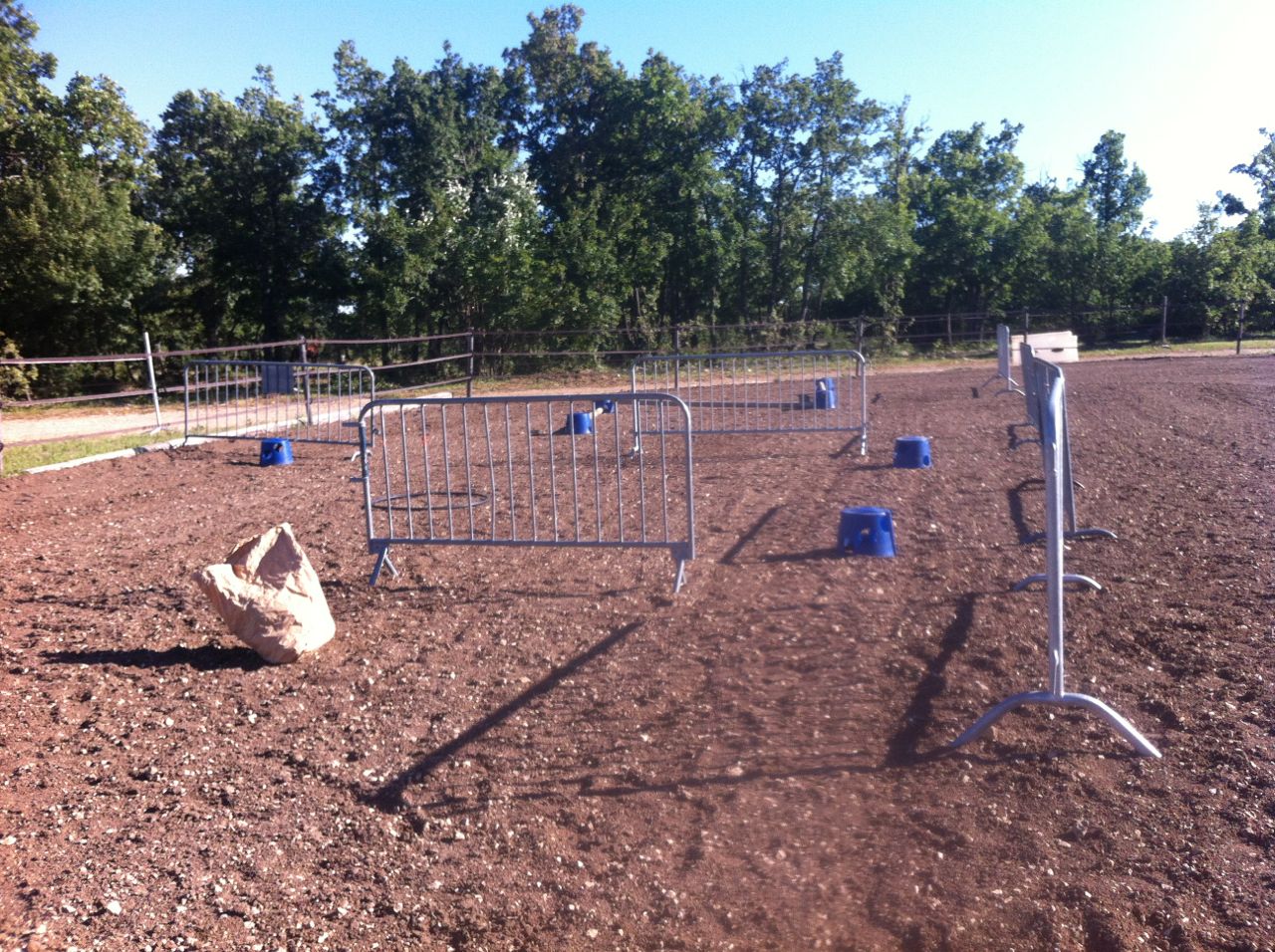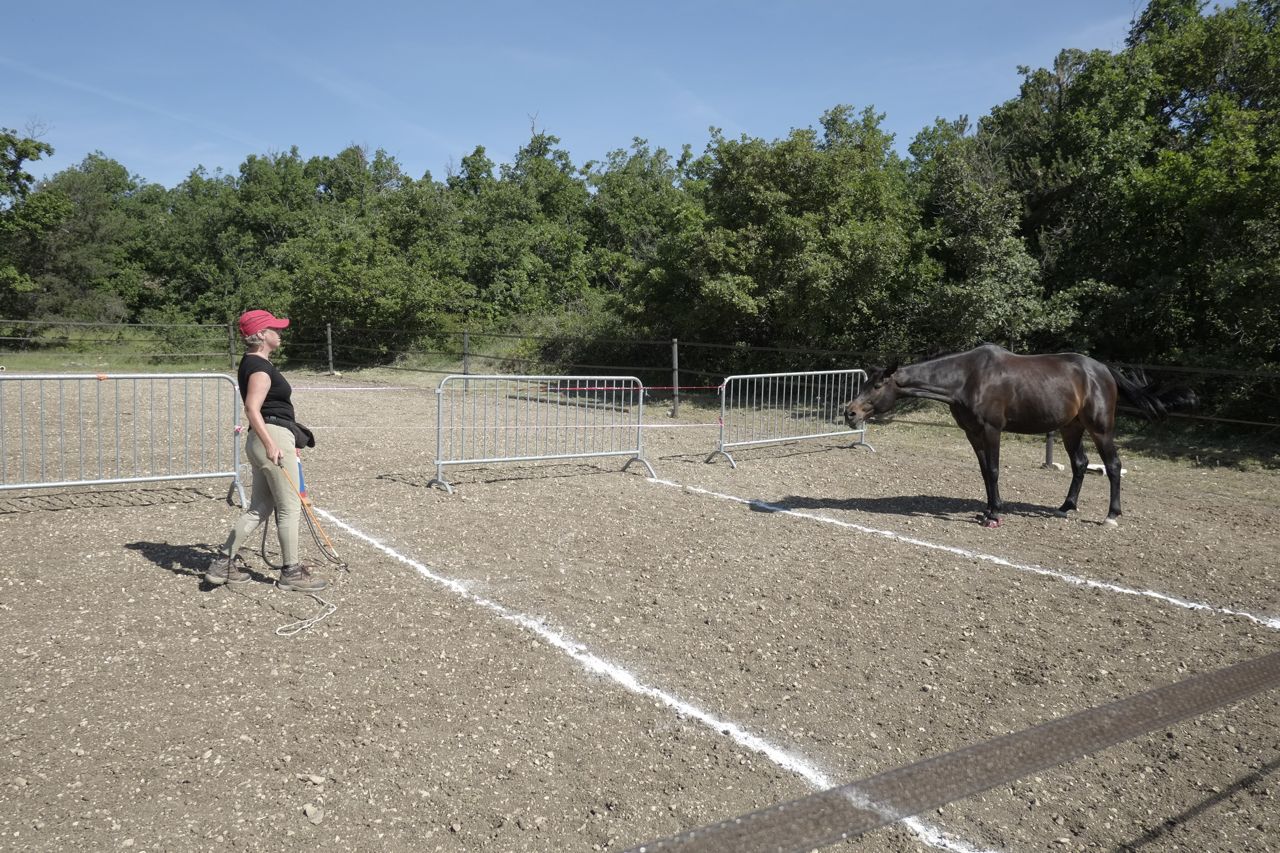 Atelier #9. Transitions. That’s the same in English. This is done with the horse at liberty, in a round pen. We were lucky to be doing this at all, considering that our round pen looked like this five days before!
