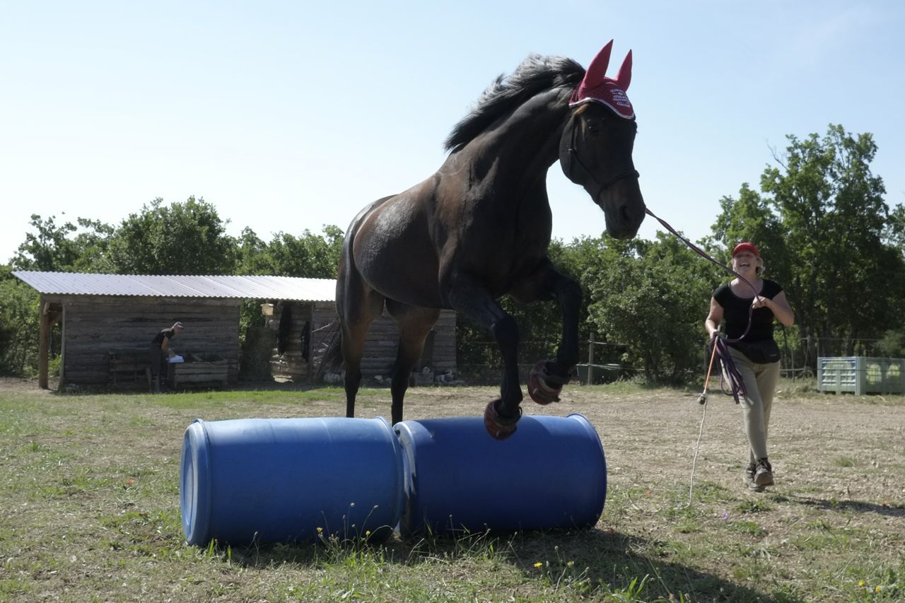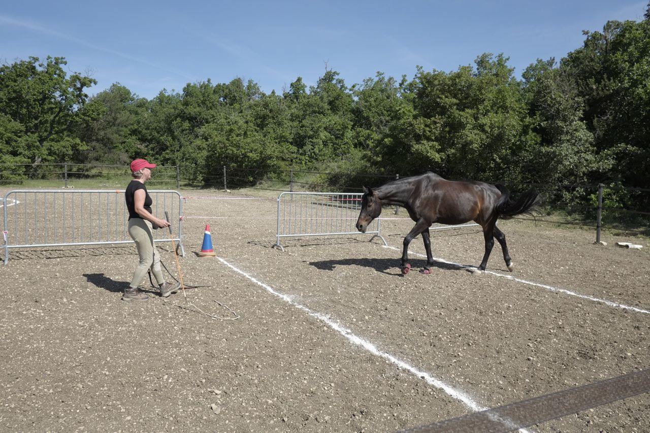 Atelier #10. Les Embûches. I’m still not sure how best to translate this. The conundrums? There are three little obstacles to negotiate; a jump, a narrow gap between two barrels and ground poles. The previous day, I wasn’t going to practice this because he’s usually good it. But MC had insisted that I do it… and she was right. The first thing Aero did that day was stop inside the gate and start eating grass. I’m afraid he had to receive a little tap with the stick to get him moving, and then he was in a huff and silly. It was not good at all and I was glad MC had made me do it.