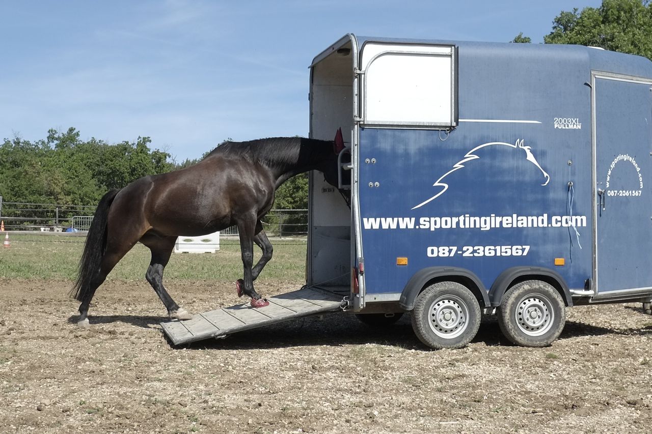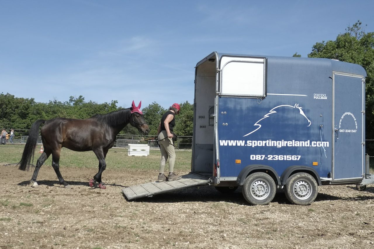 Atelier #1. Le Van. The Trailer. For 10 points, load horse and make him stand for 10 seconds before backing him out again. For 15 points, do the same except with the lead rope attached via a light elastic, so you can’t actually pull the horse in. For 20 points, do it at liberty. Oh, and you’re not allowed to touch the horse, either with the hand or the whip, apart from when you’re trying to get him to stand still for 10 seconds, when you’re allowed to caress him to encourage him to stay with you. Otherwise, each touch is -2. This applies across the board in Equifeel – you lose 2 points every time the horse is touched.