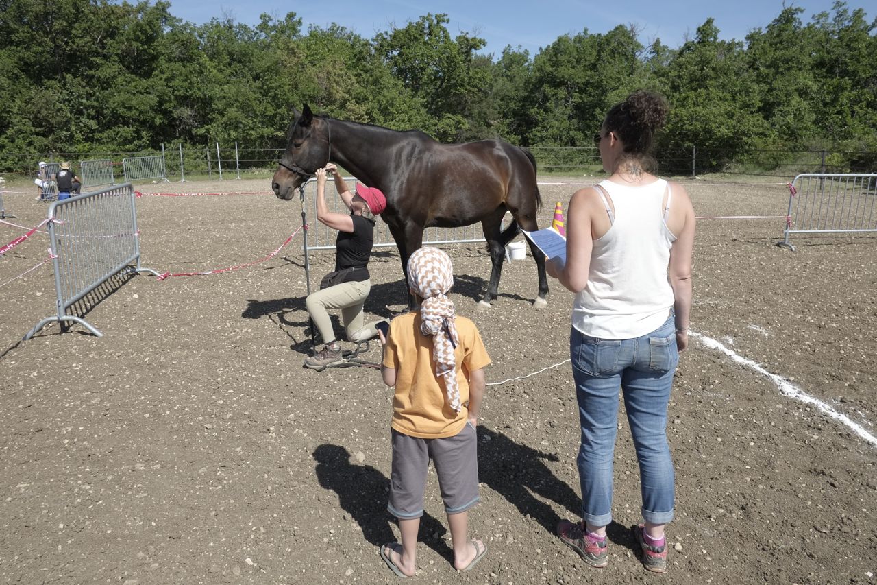 Atelier #6. Le Pivot. Turn on the haunches. The horse’s hind feet must stay inside a circle drawn on the ground while his front feet move around in a circle. We are sooooo not good at this. I opted for the 10 point contract where the horse just has to make a quarter turn. Even so, he popped a foot out of the circle twice. Only 6 points. It looked like this was not going to be our day at all.