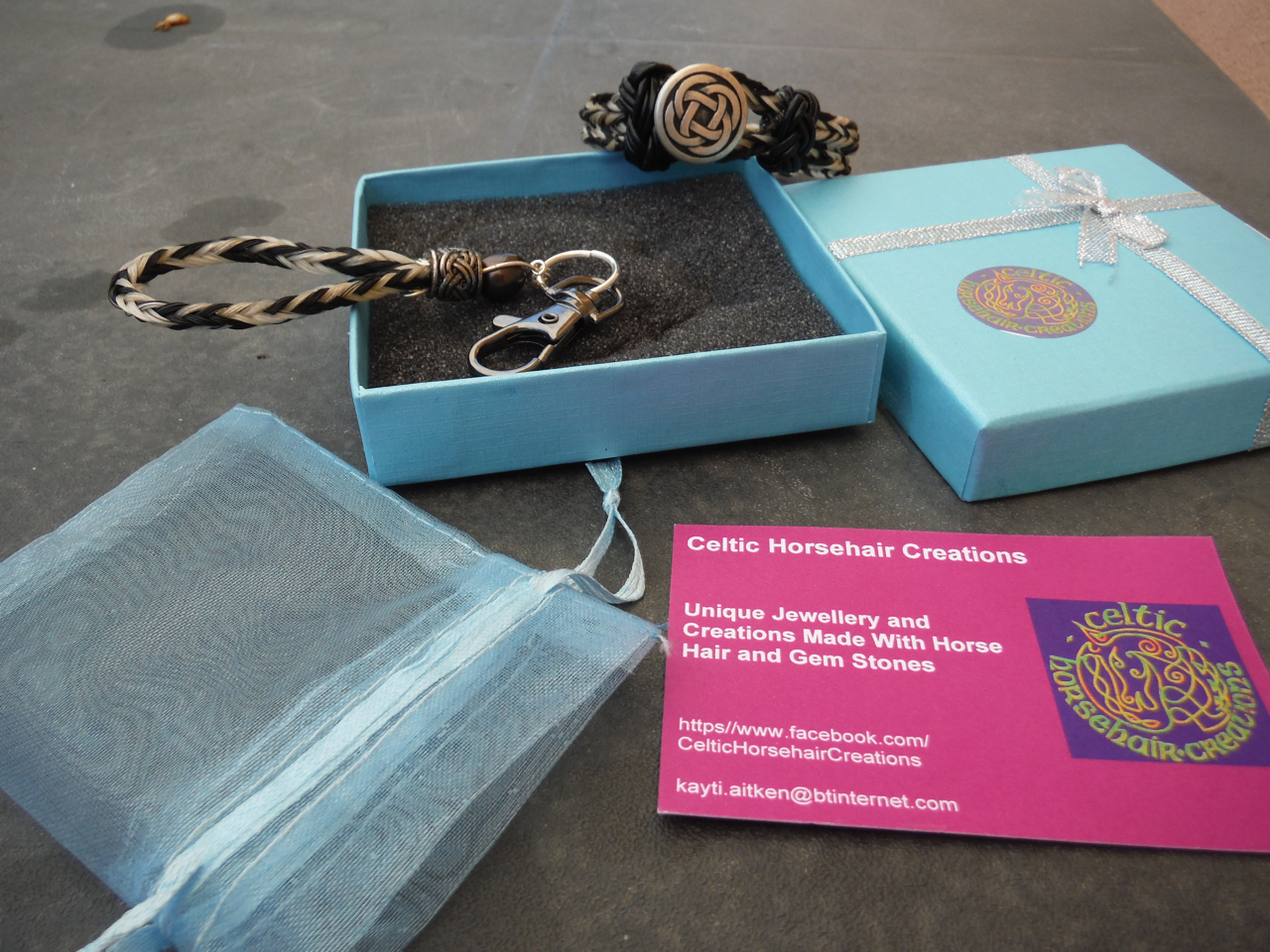 Yes, it’s made with Tails from Provence! Flurry and Aero donated a chunk of tail each and I sent them off to Kayti Aiken, aka Celtic Horsehair Creations. Kayti is one of the many on-line friends I’ve made since starting this blog. She started her own business making keepsake jewellery for horse owners about a year ago and I think it’s going well for her. I can certainly recommend it – the finish on both the bracelet and the charm is perfect, with no stray hairs sticking out anywhere and beautiful even braiding throughout. Her page is here : Celtic Horse Hair Creations Check it out – her prices are great considering how much work goes into each piece!