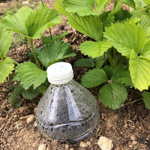 In the older strawberry bed, I have some plants which were purchased and some plants which are ‘volunteers’ – children grown from runners sent out by the adult plants. So they’re rather scattered, and the planting of plastic bottles had to be equally higgledy-piggledy in order to try and distribute some water to every plant.