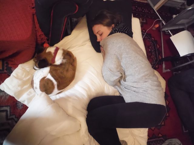 Tansy and Cookie were dog tired. Cork