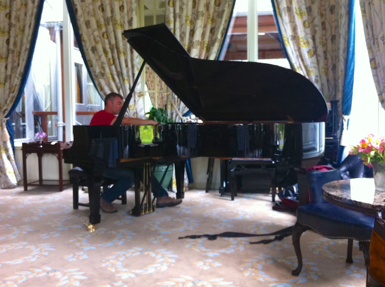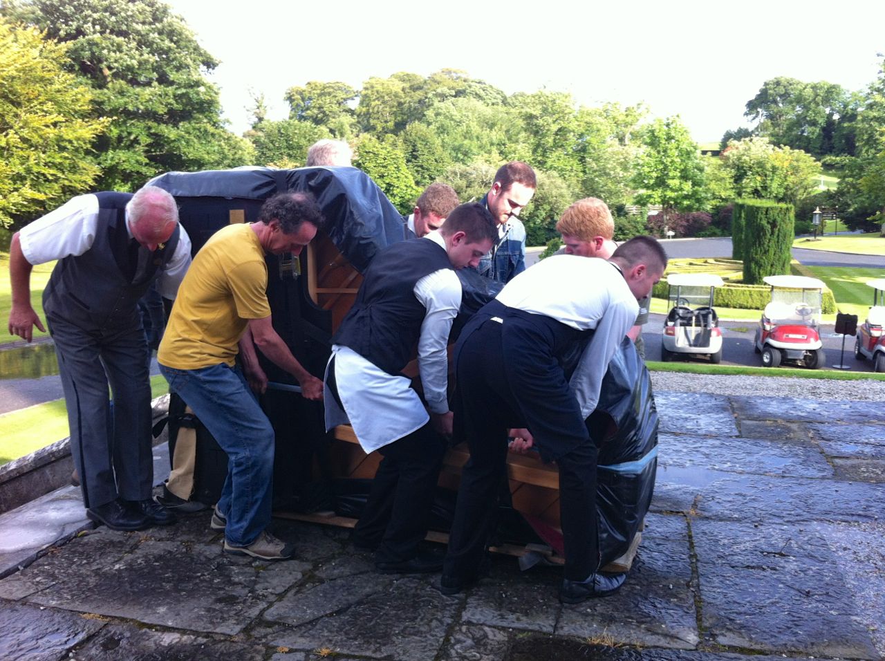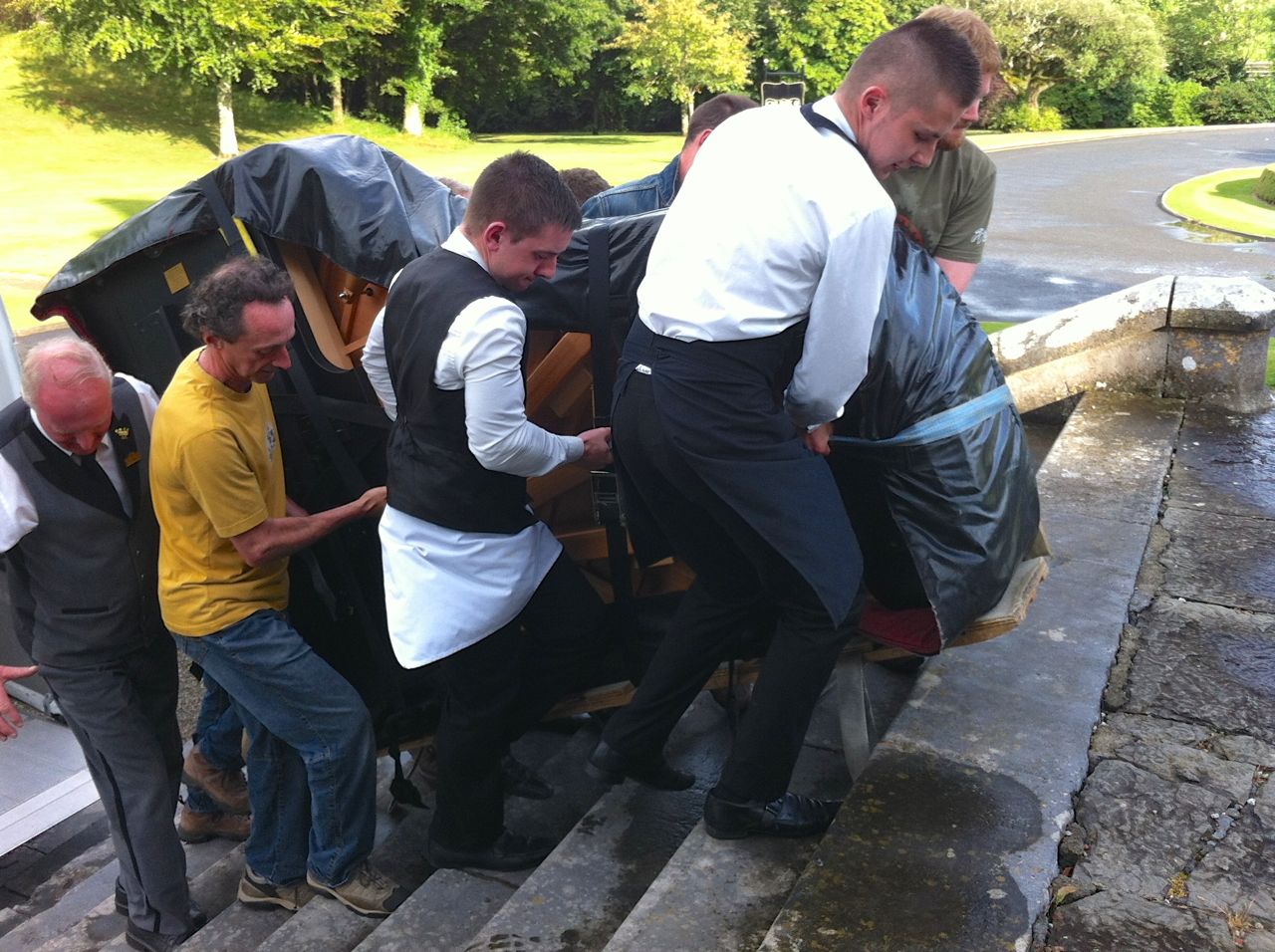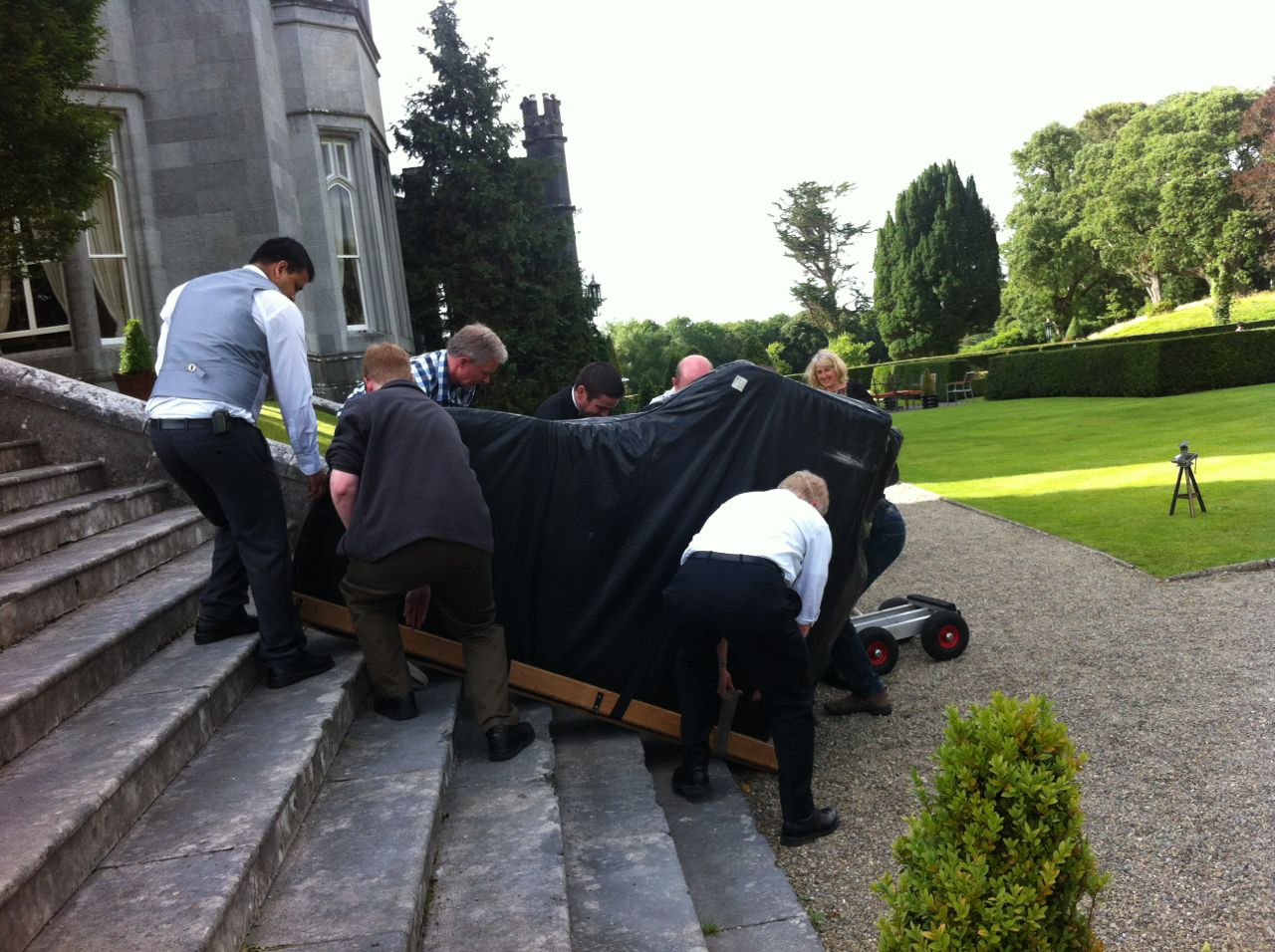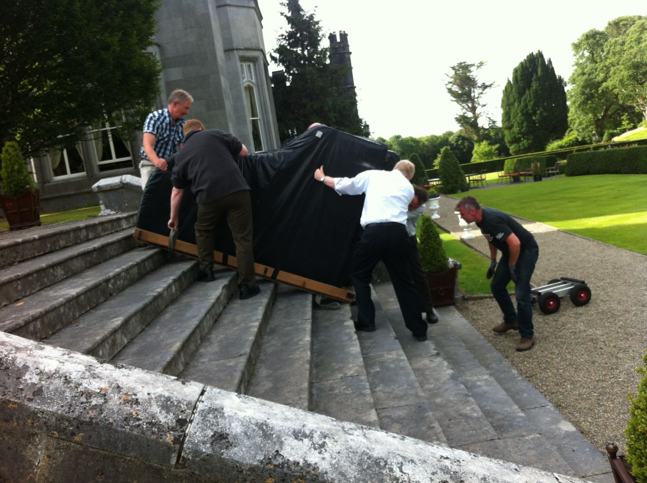 Last weekend was party time. The LSH and I once again left our dogs in the tender care of John the Dog-sitter (he’s wonderful and he has a book coming out soon!) and caught the Ryanair flight from Nice to Shannon on Friday. The piano was to be delivered to Dromoland on Saturday evening. Hotel staff had told us that there were five or six steps leading up to the room we had booked and we had told our piano rental guy about this. Not a problem, he said, so long as there’s three or four lads around to give me a hand. Three or four ‘lads’ were lined up – the LSH, the Bro, the Bro-in-Law, the Nephew and the ED’s boyfriend was available too, if needed.